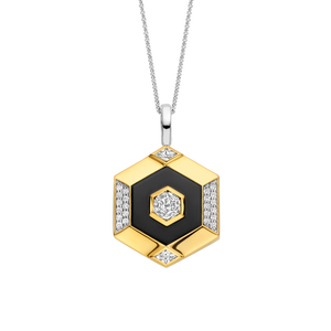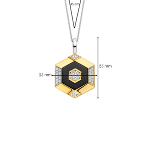 Embrace vintage glamour with a modern twist in this TI SENTO gold-plated silver Pendant 6838BL. Crafted from 925 sterling silver and plated with gleaming yellow gold, this geometric stunner is guaranteed to add a touch of opulence to any outfit. The striking hexagon shape frames a luxurious black stone, its rich colour captivating the eye. Delicate cubic zirconia stones dance around the edge adding a hint of sparkle. This statement pendant is a conversation starter, adding a touch of nostalgia to any look. Channel your inner fashion icon with a bold and architectural design that pairs perfectly with a simple blouse or a plunging neckline. Let the pendant be the star of the show, or combine it with other TI SENTO necklaces for a personalised and charming look. Crafted with care for sensitive skin, this nickel-free and hypoallergenic pendant ensures lasting comfort and quality. Embrace the enduring allure of geometric shapes and a touch of bygone eras with this unforgettable pendant.