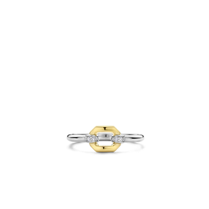 This TI SENTO gold-plated silver ring 12300ZY showcases a gold-plated centrepiece with details of cubic zirconia pavé. This luxurious and minimalist design will add a touch of sophistication to your fingers on any occasion. Crafted from the highest quality 925 sterling silver, the ring is then plated with precious platinum to protect it and keep it luminous. Embrace its geometrical vintage shape and elevate your look. The ring is completely nickel-free and hypoallergenic.