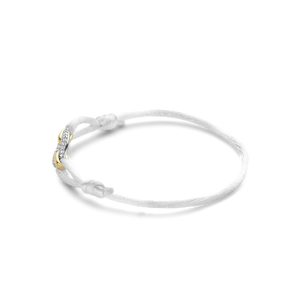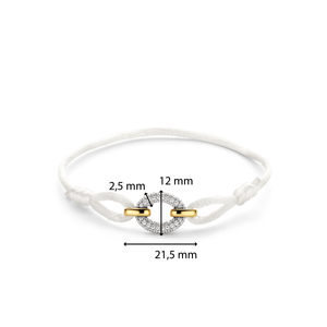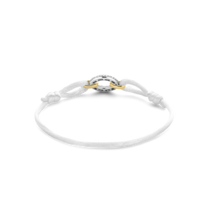 This TI SENTO silver bracelet 23020ZY flaunts a luxurious pavé link of white cubic zirconia (CZ) stones set by hand. A lustrous white silk cord is held by two tiny silver links plated with yellow gold. The bracelet is crafted from the highest quality 925 sterling silver. Decorate your wrists with this opulent cord bracelet inspired by the purity and freshness of love. All of our bracelets are nickel-free and hypoallergenic.