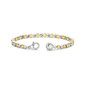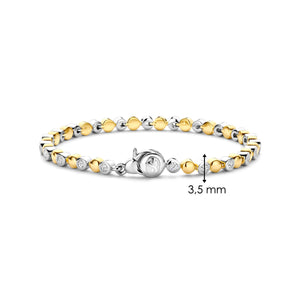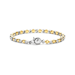 Embrace the warmth of summer with the TI SENTO Gold-Plated Silver Bracelet 23066ZY, a modern interpretation of timeless design. Crafted from 925 sterling silver and plated with premium platinum to protect it and keep it luminous, this beautiful bracelet features a captivating interplay of yellow gold-plated half-bubble domes alternating with sparkling white cubic zirconia set in silver settings. The central focal point is a stylised signature TI SENTO symbol, adding a touch of understated sophistication to this charming piece. The warm golden hues evoke the glow of a summer sunset, creating a piece that is both elegant and effortlessly chic. Crafted with care for sensitive skin, this nickel-free and hypoallergenic bracelet ensures lasting comfort and quality.
