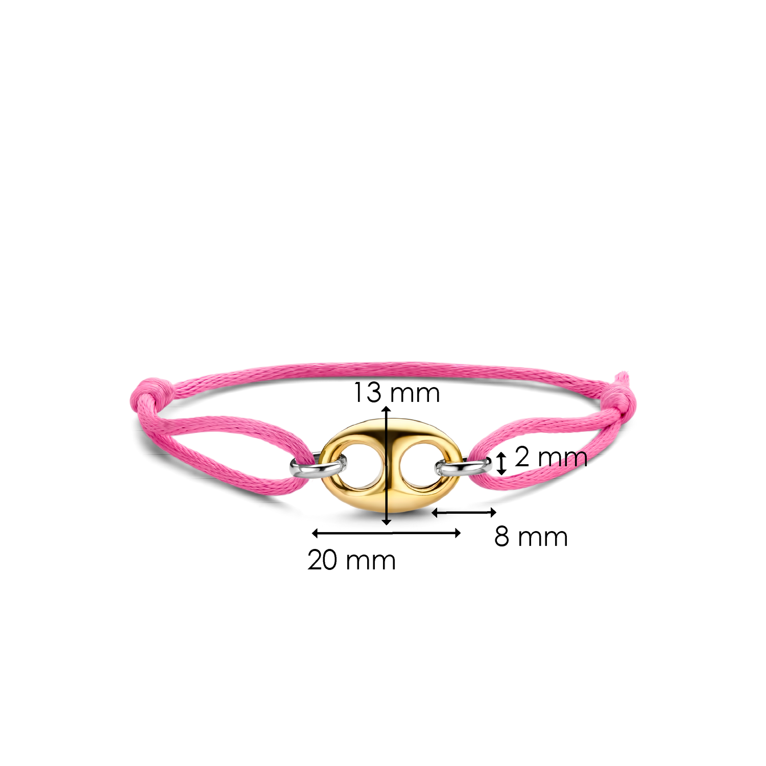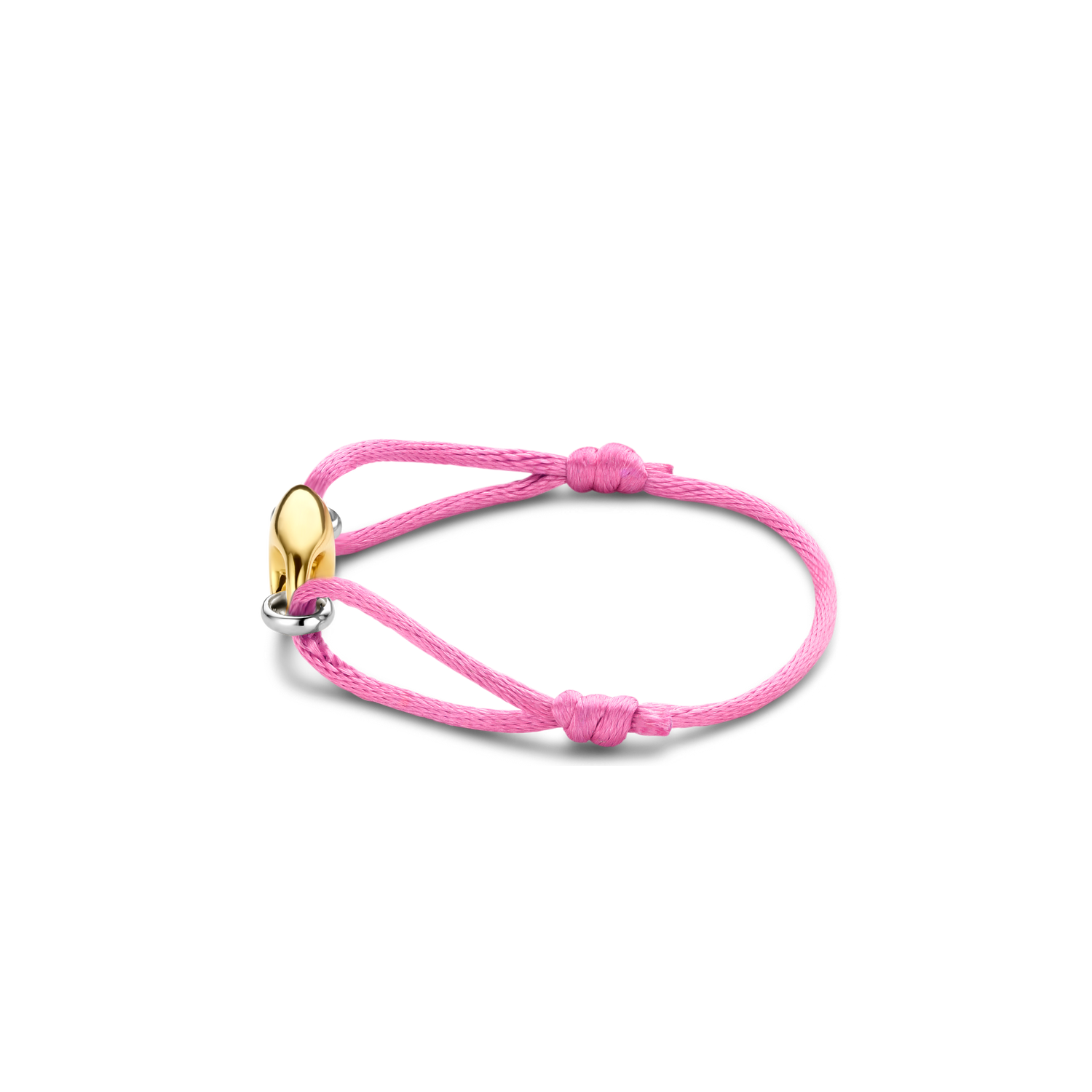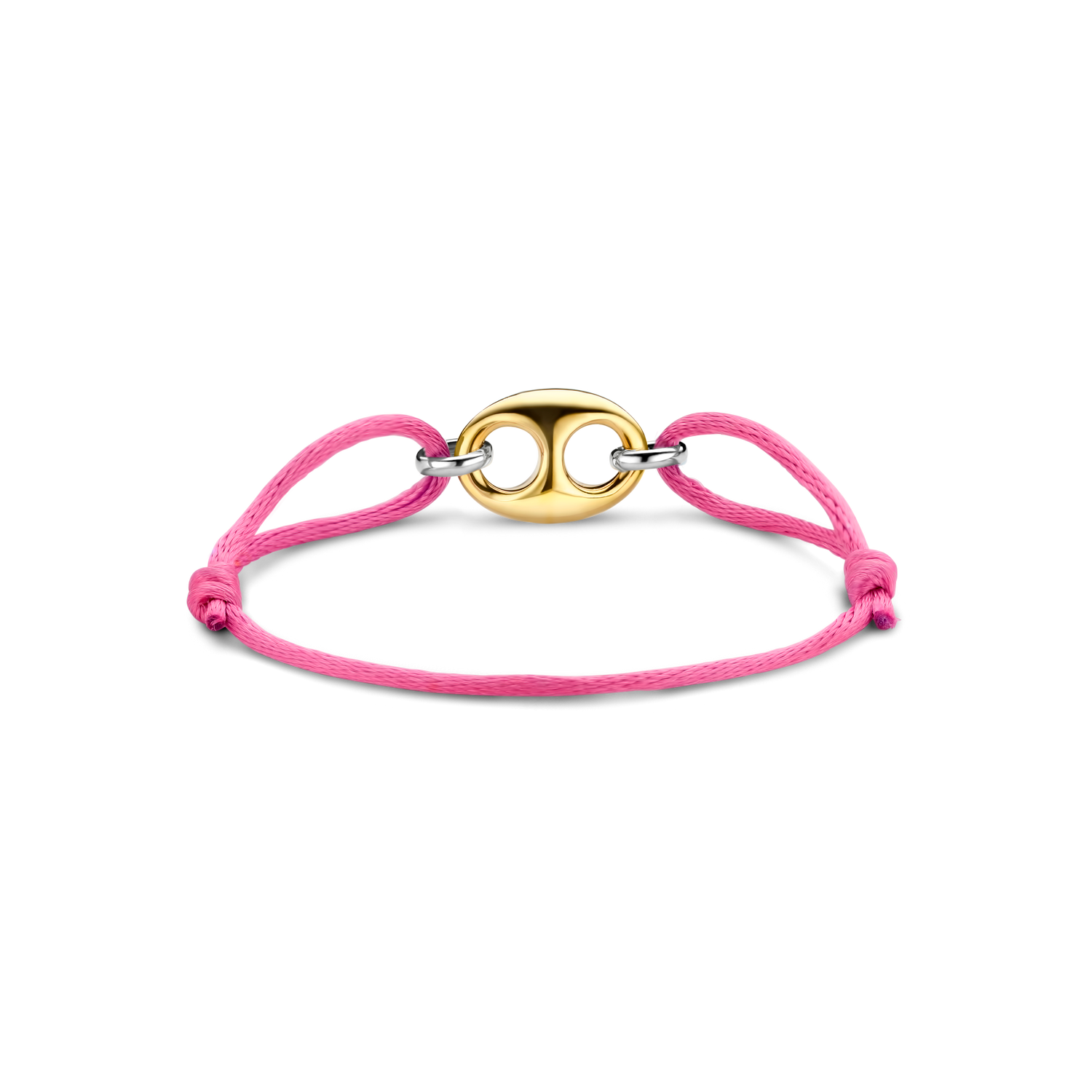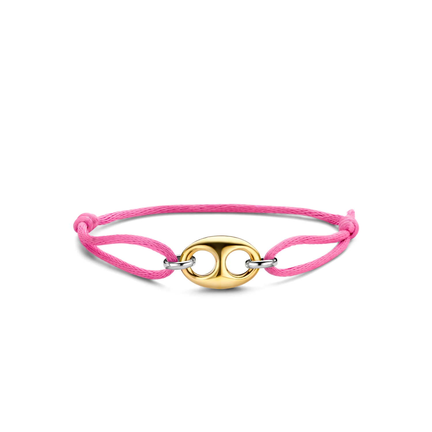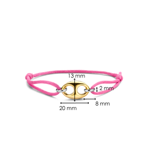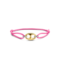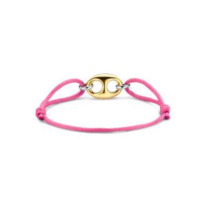 This TI SENTO gold-plated silver bracelet 2986PY features a gold-plated coffee bean token as its centrepiece. A pink silk cord is held together by two silver links. The bracelet is crafted from 925 sterling silver. Its classic coffee bean shape was redesigned with a touch of playful edginess. Beautify your wrists with its glamorous pink hues.