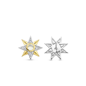 These TI SENTO silver stud earrings 7932MW flaunt a star shape with a mother of pearl centrepiece. These star ear charms alternate yellow gold-plating and a pavé of cubic zirconia stones. Crafted from premium 925 sterling silver, they are then coated with a platinum layer to protect them from daily wear and keep them luminous. The contrast between the white mother of pearl and opulent yellow gold creates a luxurious contrast that immediately catches the eye. Let these tiny stars light up the universe. They are completely nickel-free and hypoallergenic.