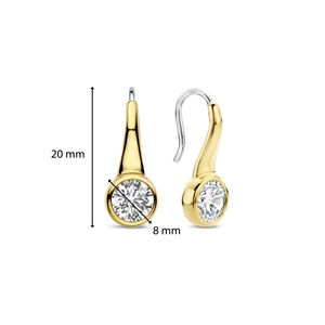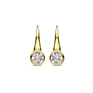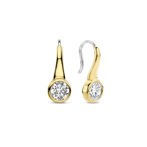 These TI SENTO gold-plated earrings 7951ZY flaunt two white zirconia stones handset in flawless bezel settings. These captivating earrings are crafted from the highest quality 925 sterling silver and then plated with yellow gold for an opulent and warm touch. The golden brilliance enhances the timeless appeal of the bezel setting, making it a classic choice that stands the test of time. Embrace the allure of these earrings that effortlessly combine classic elegance with a touch of modern sophistication. All our earrings are nickel-free and hypoallergenic.