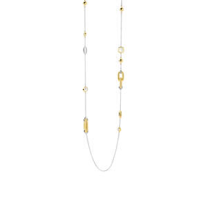 This TI SENTO gold-plated necklace 34045ZY/80 is a statement piece that blends a luxurious appeal with a captivating blend of shapes and textures. This long chain necklace features an exquisite combination of luminous pearl, delicate mother of pearl, dazzling pave, and warm yellow gold plating. Two signature gold-plated links with a refined twisted structure are the centrepiece of this design. The necklace showcases an artful arrangement of both square and round shapes, adding a touch of modern sophistication to the design. Crafted from premium 925 sterling silver, the necklace features yellow gold plating which adds a touch of vibrancy and radiance. This necklace is a true embodiment of opulence, offering versatility and sophistication in every detail. Wear it as a standalone statement piece to demand attention or layer it with other necklaces for a chic, bohemian look. Like all our jewellery, this necklace is nickel-free and hypoallergenic, promising not just style, but also comfort and quality that stands the test of time.