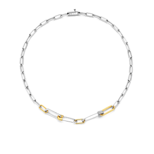 This TI SENTO gold-plated link necklace 34047ZY/48 displays a stream of signature chain links including gold-plated ones and two safety pins, creating a dynamic interplay of textures and sparkle. Crafted from premium 925 sterling silver, it is coated with precious platinum to protect it from daily wear and keep it luminous. Radiant gold-plating and cubic zirconia pave add vibrancy and luxury to the design. The necklace is a bold and sophisticated statement piece that seamlessly merges edgy design with refined elegance. Versatile and eye-catching, this necklace effortlessly transitions from casual to formal occasions, making it a must-have accessory for the modern and trend-setting woman. Elevate your style with this signature chain link necklace that exudes bold sophistication and moden classic charm. Like all our jewellery, this necklace is nickel-free and hypoallergenic, promising not just style, but also comfort and quality that stands the test of time.