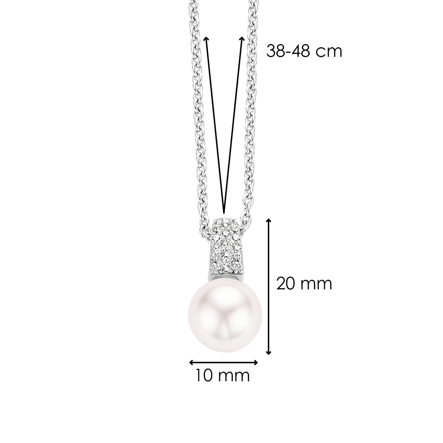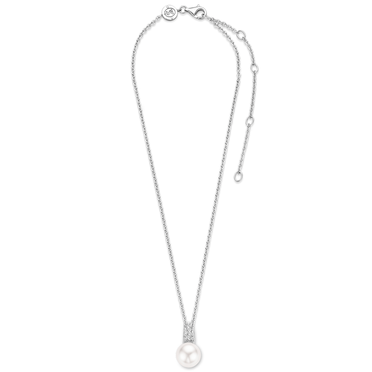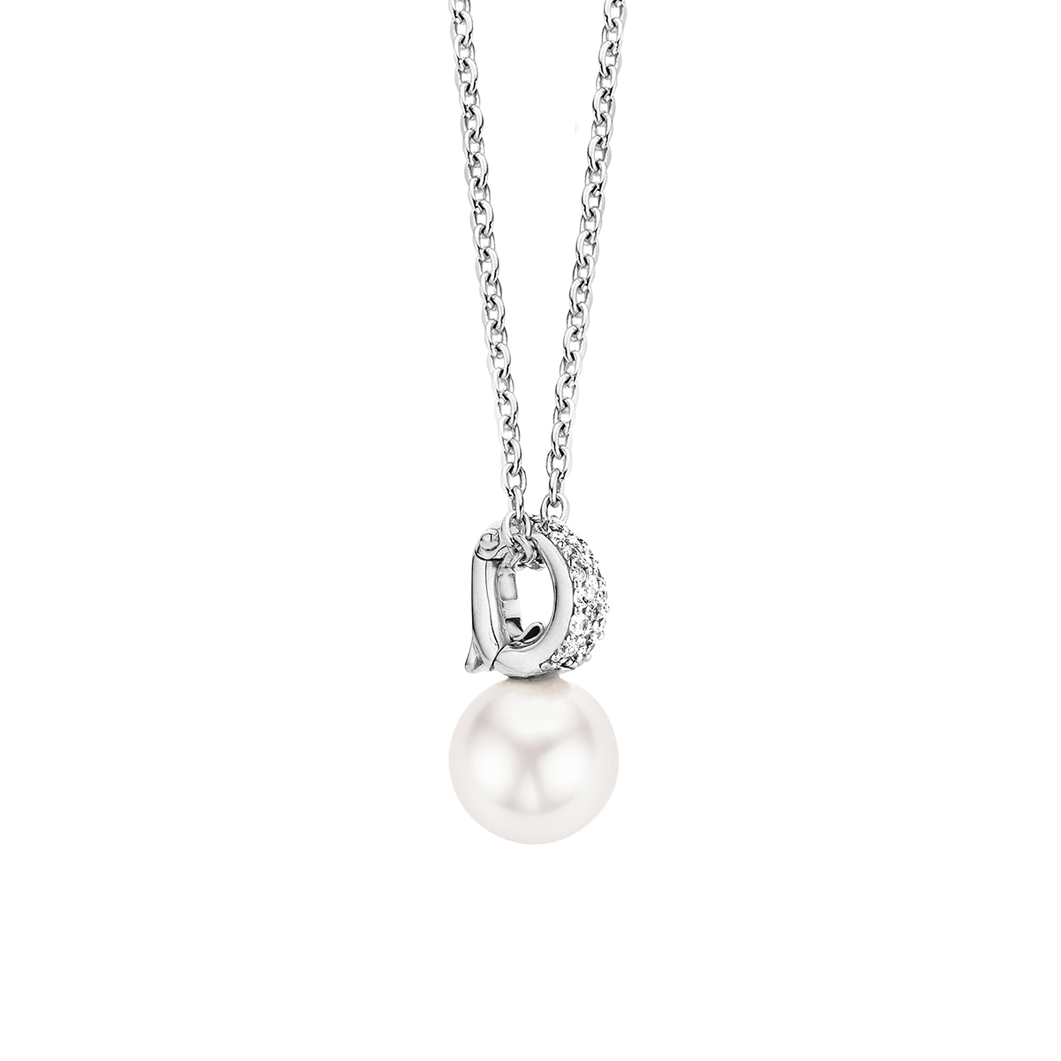 A classic TI SENTO necklace with reference number 3877PW. The necklace has a pendant with pave set Zirconia with underneath a white Swarovski pearl. The necklace is made of Rhodium plated Sterling silver. The Rhodium layer gives a long lasting shine and protection against decolourisation to the jewellery piece. The combination of pearl and Zirconia make the necklace is easy to combine with other TI SENTO jewellery pieces.