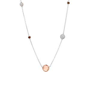 The evening lights are reflected in this unique necklace. Full of character; her brown and rose coloured stones, white zirconia pavé designs and rose gold give this a feminine and magical look.
