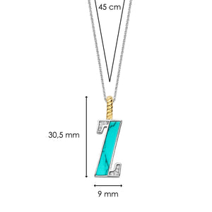 Embrace endless summer with this TI SENTO gold-plated silver Letter Z Pendant 6840TQ_Z. This vibrant pendant features a refreshing turquoise stone inlay forming the letter "Z" in beautiful contrast with the sparkling pavé of white cubic zirconia. Crafted from lustrous 925 sterling silver, it is then coated with precious platinum to protect it and keep it luminous. Its clip ring is plated in rich yellow gold for an opulent and warm touch. Let the colour turquoise transport you to the Mediterranean Sea, sparking an unquestionable holiday mood. A symbol of bold allure, the letter Z whispers of your trendsetting style and fearless pursuit of standing out from the crowd. This pendant is more than an accessory; it's a playful expression of your individuality. Wear it solo for a vibrant statement or layer it with other letters or pendants for a trendy, layered look. The pendant comes with a delicate 45cm silver chain that adds a touch of elegance. Crafted with care for sensitive skin, this nickel-free and hypoallergenic pendant ensures lasting comfort and quality.