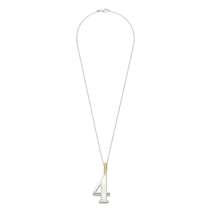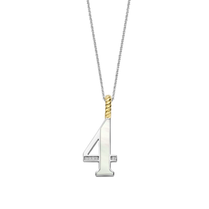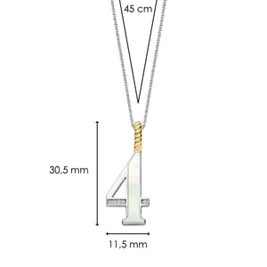 Embrace timeless elegance with this TI SENTO Number Four Silver Pendant 6841MW_4. Crafted from premium 925 sterling silver and plated with platinum to ensure lasting brilliance, this pendant features a striking number four design. The number is adorned with a captivating mother-of-pearl inlay, its iridescent hues evoking the magic of the ocean. A shimmering pave of white cubic zirconia stones completes the design, enhancing the overall luminosity. The clip ring is plated in yellow gold, exuding luxury and radiance. The number four symbolises stability, foundation, and harmony. It represents the importance of creating a solid base from which to build and grow. Mother-of-pearl, a symbol of purity and femininity, lends a touch of ethereal beauty to this pendant. This piece is perfect for the modern woman who values both strength and sophistication. Let this pendant be the cornerstone of your refined aesthetic. Wear it solo for a classic statement or layered with other pieces for a curated look. The pendant comes with a delicate 45cm silver chain. Crafted with care for sensitive skin, this nickel-free and hypoallergenic pendant ensures lasting comfort and quality.