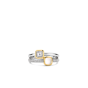 This TI SENTO gold-plated ring 12326MW is a captivating blend of sophistication and versatility. The ring features two stacked bands: one boasts a lustrous mother of pearl square stone, delicately handset in a radiant yellow gold-plated setting. Its shank flaunts a brilliant pave of cubic zirconia, adding an extra layer of glamour. The second band flaunts a square cubic zirconia, handset in a gold-plated setting and featuring a smooth shank that exudes modern elegance. The ring is crafted from premium 925 sterling silver and plated with radiant yellow gold. Whether worn alone or stacked with other rings, this duo allows you to curate your own distinctive look. Elevate your style with this playful ring, where the fusion of mother of pearl, cubic zirconia, and gold-plated accents creates a dynamic and personalised statement. Like all our jewellery, this ring is nickel-free and hypoallergenic, promising not just style, but also comfort and quality that stands the test of time.